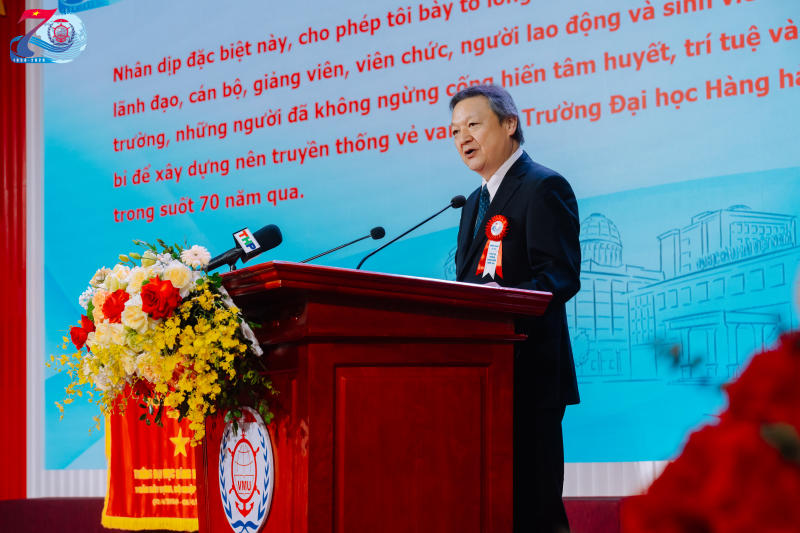 Trong diễn văn tại Lễ kỷ niệm, PGS.TS. Phạm Xuân Dương - Bí thư Đảng ủy, Hiệu trưởng trường Đại học Hàng hải Việt Nam đã ôn lại quá khứ hào hùng của nhà trường. Cách đây tròn 70 năm, dưới sự quan tâm đặc biệt của Chủ tịch Hồ Chí Minh, của Đảng và Nhà nước, trường Đại học Hàng hải Việt Nam - “Mái trường Đại dương” thân yêu, cái nôi đào tạo nguồn nhân lực cho ngành hàng hải Việt Nam - đã được thành lập tại thành phố Hải Phòng anh hùng.
