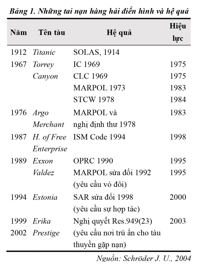 Những giải pháp IMO đã thực hiện nhằm hạn chế những tai nạn thảm hoạ tương tự có thể xảy ra thông qua thay đổi, bổ sung, cập nhật hệ thống luật pháp như trong Bảng 1 [7]; yêu cầu bảo đảm và nâng cao an toàn hàng hải nếu không tính tới mặt kỹ thuật thì hầu như đều hướng tới mục tiêu là bảo vệ con người hoặc yêu cầu con người phải thực hiện, tuân theo. Hầu hết, giải pháp yêu cầu thực hiện thường tập trung vào giải quyết, ngăn chặn các vấn đề liên quan đến lỗi con người đã được tác giả đề cập trong Mục 3.1.